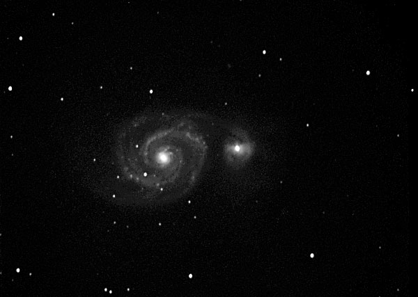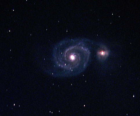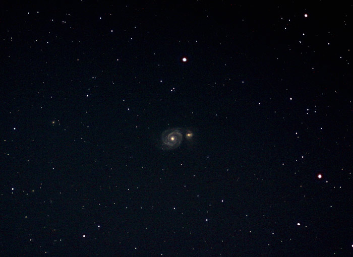 Wide field view of M51 region. Image is obtained through Celestron 102mm/f5 refractor on Canon EOS 300D. Image is assembled of ten 30-second exposures, two 100second and one 300 second exposures at 1600 ASA (dark substracted and processed in Photoshop - field of view is 1,5x1 degree)